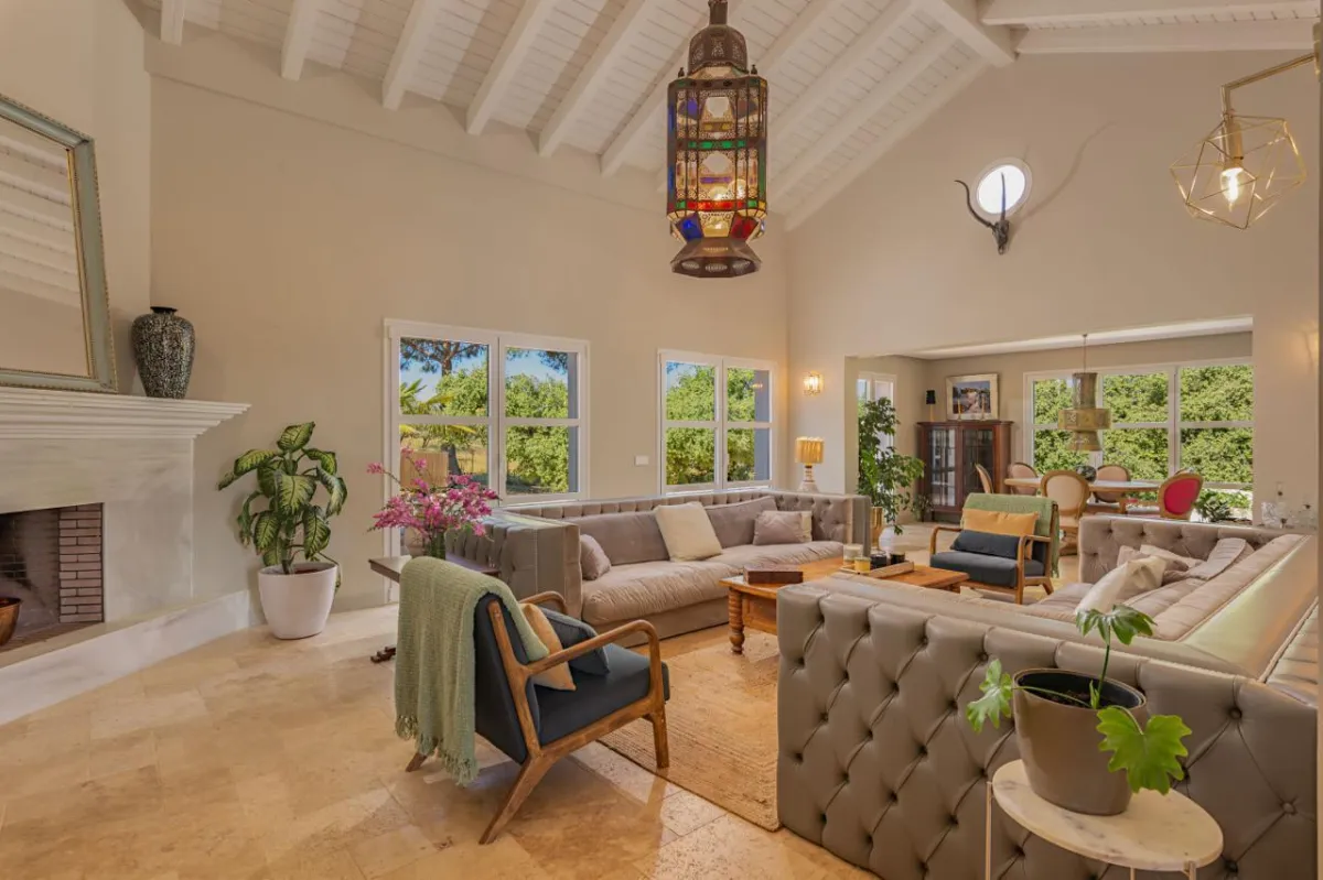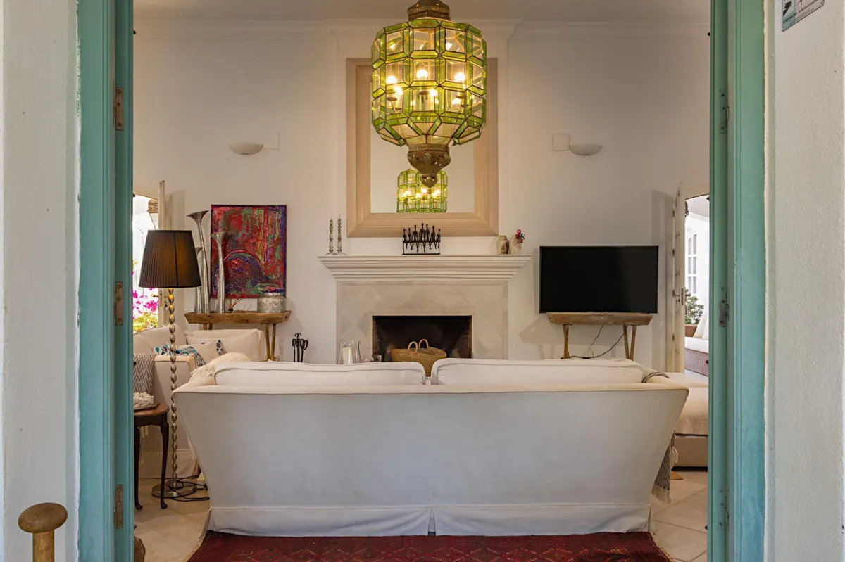 The main house offers several suites with private bathrooms, a large living room with a fireplace, a covered terrace, a patio with a central palm tree and two swimming pools (a heated indoor Roman-style pool and an outdoor pool with panoramic views). It includes an outdoor kitchen, outdoor dining areas and permission to plant your own vineyard.